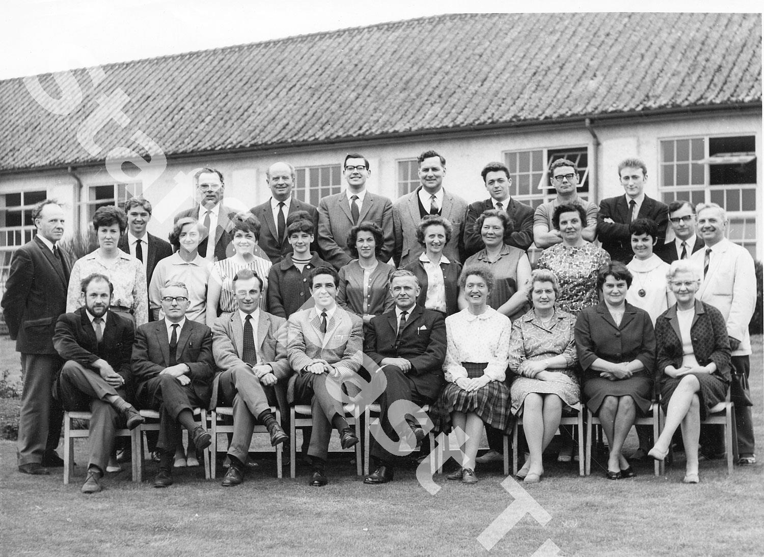 Back row (left to right): unknown, Fred Greaves (Maths), Phil Jones (PE), Frank Dudley (Music), Mr Brain (History), Richard Ash, Mr Griffiths (Maths, PE), John Loch (Geography ,PE), Tim O'Malley.