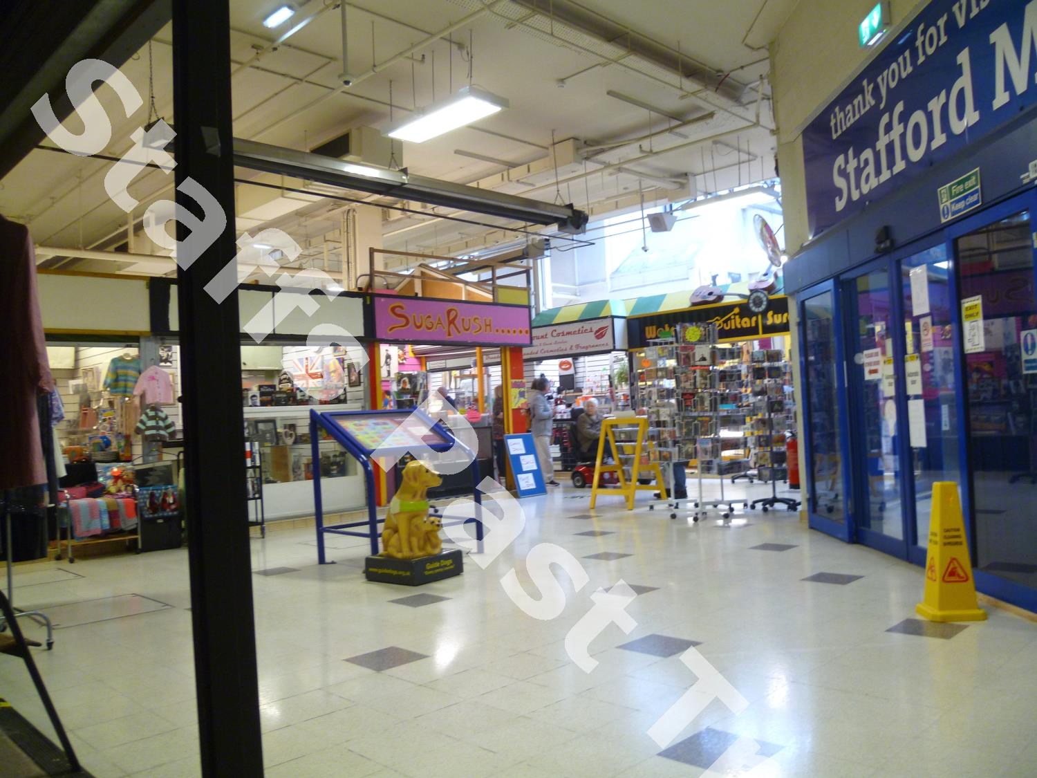 Description:This interior view, taken by one of the entrances to Stafford’s indoor market hall, shows some of the stalls shortly before the market closed for good.