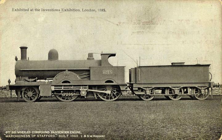 'The Marchioness of Stafford' was exhibited at the 'Inventions Exhibition' in London, 1885, along with a working scale model of the locomotive together with several other LNWR innovations. It was one of forty locomotives built as LNWR’s ‘Dreadnought Class' between 1884 and 1888 at their Crewe Works. It was used for express passenger traffic haulage. It was designed by Francis William Webb, the Chief Mechanical Engineer, who had been born in Tixall Rectory, Tixall, in 1836. This class was scrapped entirely between 1903 and 1905.