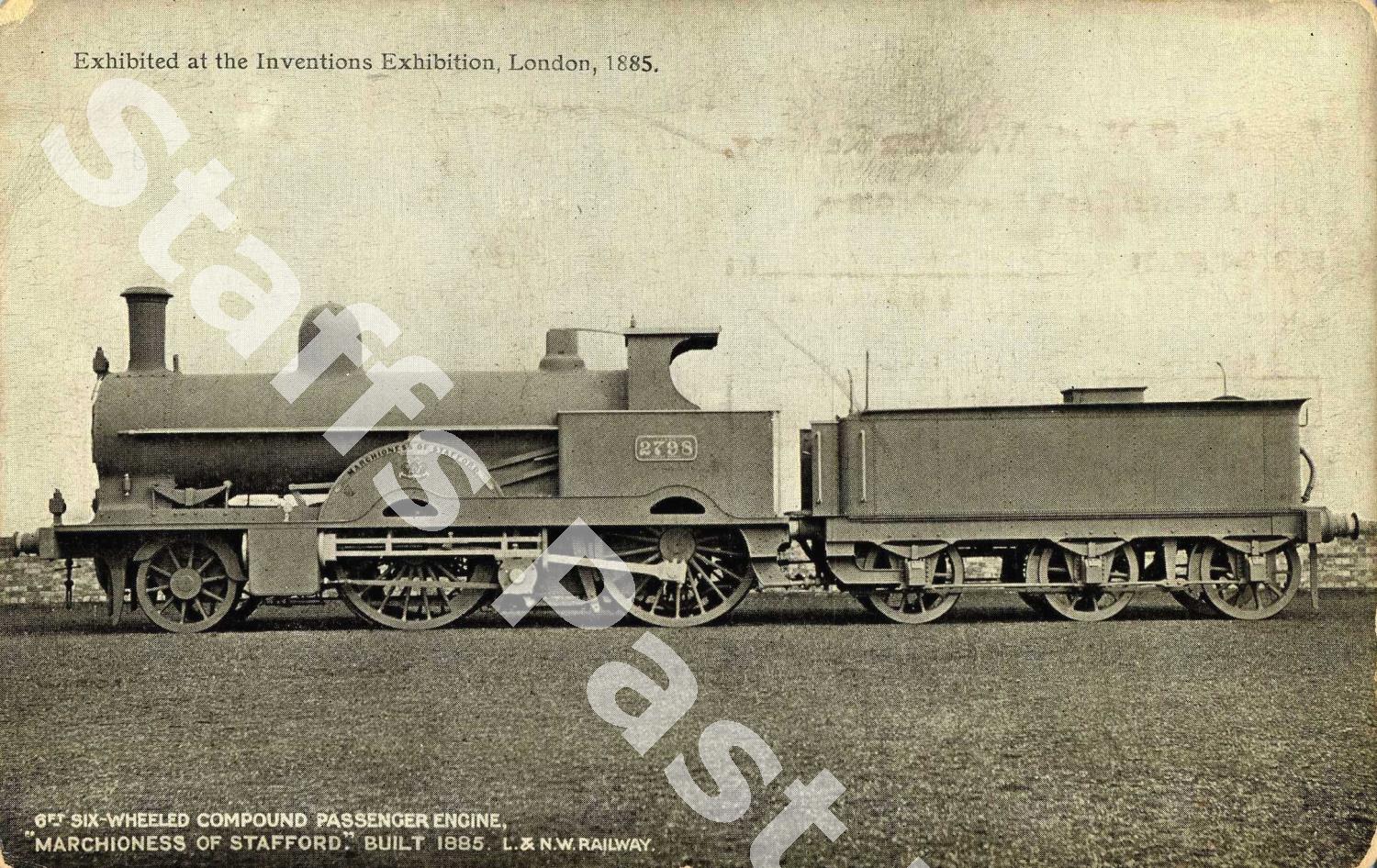 Description:A postcard view of locomotive 'The Marchioness of Stafford', No. 2798, built in 1885 by the London & North Western Railway (LNWR).