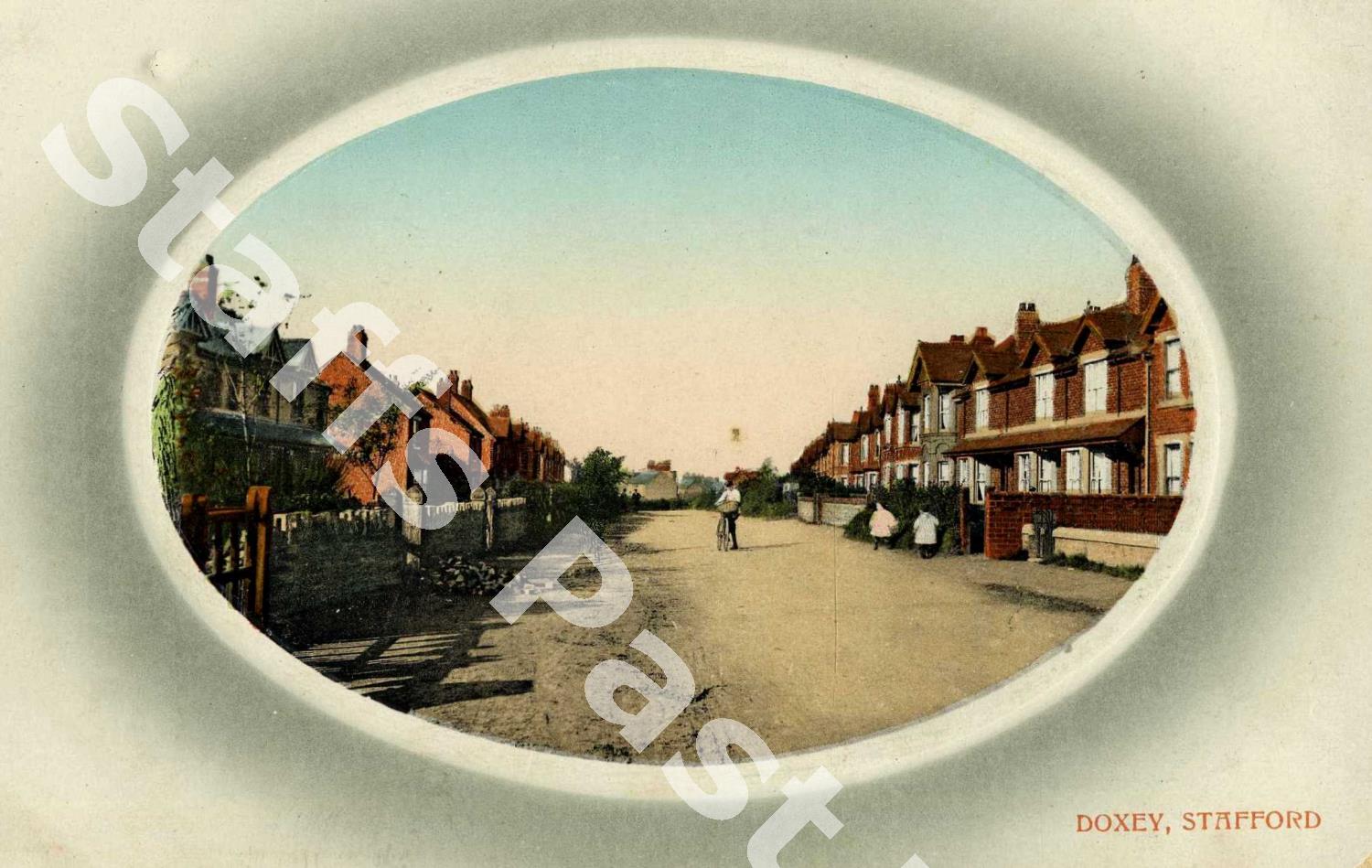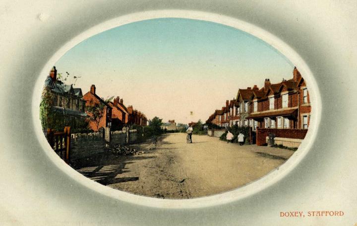 Description:This vignette-effect framed postcard looks north-west along Doxey Road from Stafford.