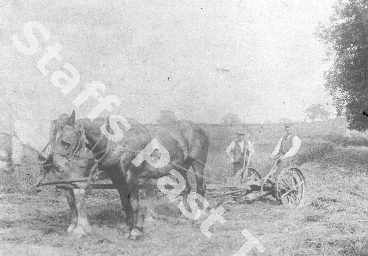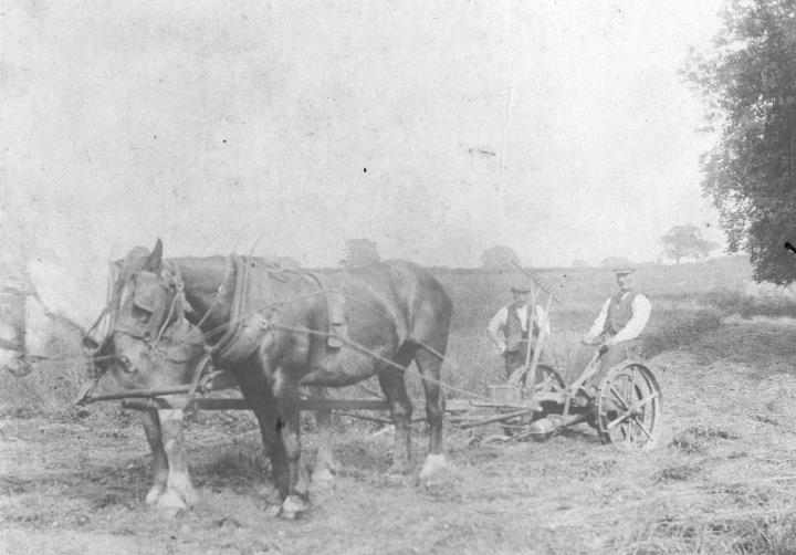 Description:George Hodgkins of Felt House Farm, Cheddleton, mowing hay with a horse drawn mower.
