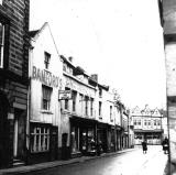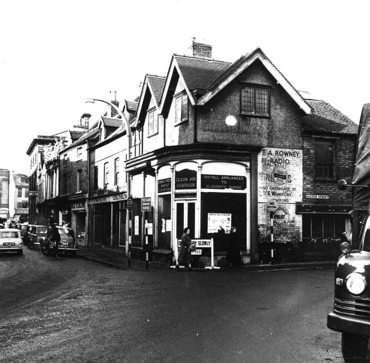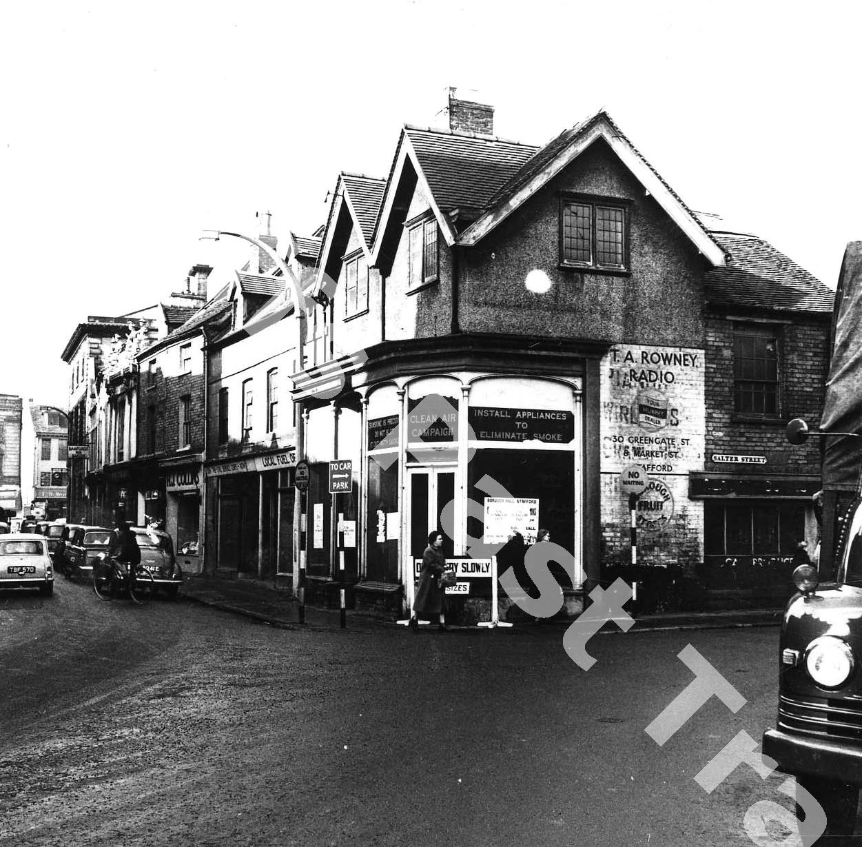 Description:This view looks west along the shops on Market Street prior to their demolition in 1963. On extreme left there is a glimpse of the Guildhall and F.W. Woolworths on Market Square. Also, on the left at the end of the row of shops is Lloyds Bank which remains (2025) on the corner of Market Square. On the right is Salter Street. The entire block of shops in the centre was later demolished and replaced with a run of modern shops. When the buildings were demolished in 1963, behind their Georgian looking facades, timber-framed construction dating from the 15th century or 16th century was discovered. On the rooftop prior to the Bank at No. 4, Market Street formerly a tea warehouse, the 18th Century ornamental figures of Chinese tea-tasters can be seen. They were made from brick and tile rubble, cemented together and covered in plaster. The detail was modelled in plaster on a brickwork base. The figures were a form of advertisement at a time when tea was an expensive commodity. When this photograph was taken the shop was 'Motor Cycle Mecca'. After the building was demolished, the figures were temporarily re-positioned on the roof of the former Library at The Green and are now in the County Museum collection.