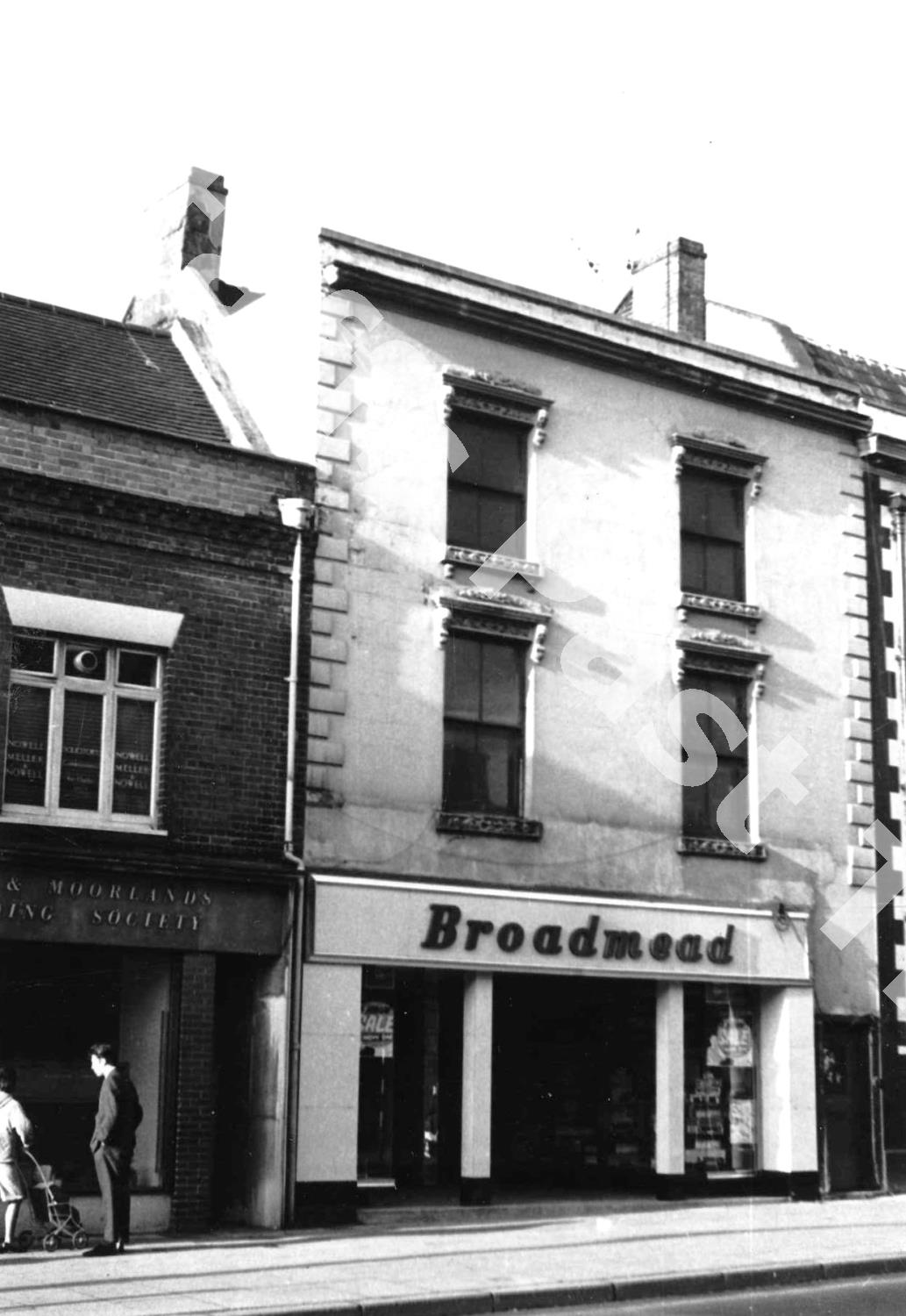 Description:Broadmead at No.44. Greengate Street, Stafford, was a radio and television sales shop. On the left is a part view of the former Leek & Moorlands Building Society. These buildings have since been demolished and replaced with modern premises, currently (2026) on the left is the Co-op Bank and No. 44 was occupied by the Halifax Bank until it recently closed.