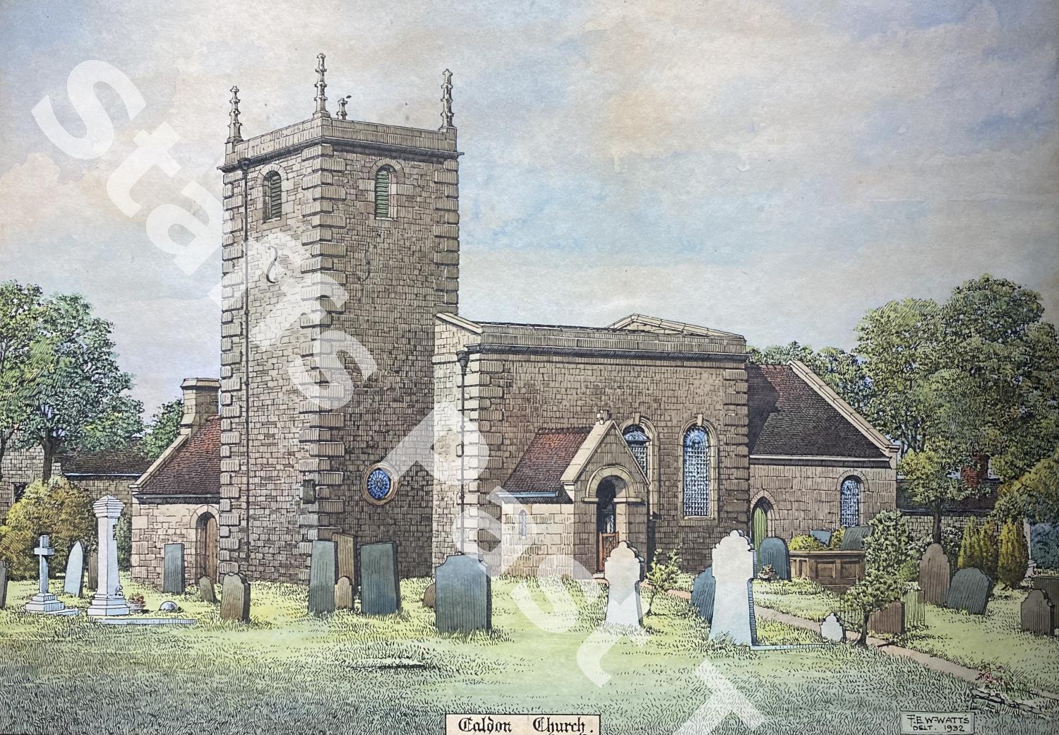 Description:A pen and watercolour view by F.E.W. Watts of St. Mary and St. Laurence's Church, Cauldon. The church was rebuilt in 1781-1784 although the chancel retains walling from an earlier church. The south porch by J.R. Naylor was added in 1885 and the north aisle in 1926.