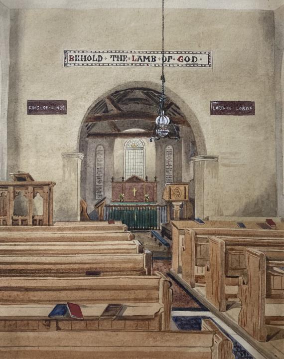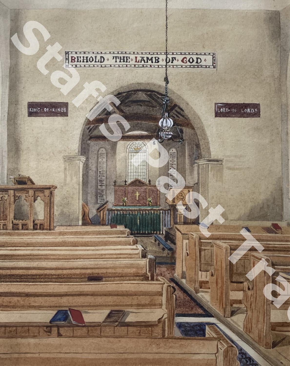 Description:A watercolour view by an unknown artist of St. Mary and St. Laurence's Church, Cauldon. The church was rebuilt in 1781-1784 although the chancel retains walling from an earlier church. The south porch by J.R. Naylor was added in 1885 and the north aisle in 1926. This painting was made before the stained glass Crucifixion was installed in the east window in 1936.