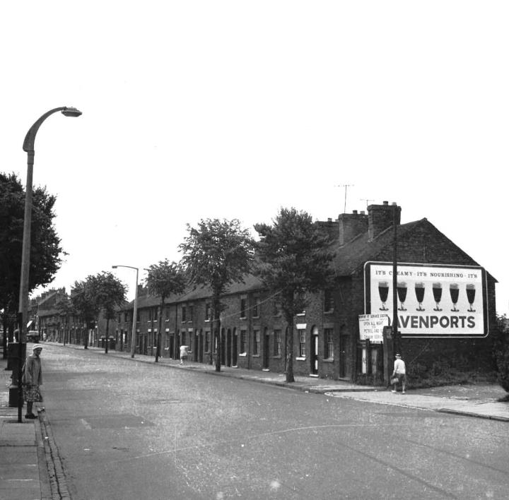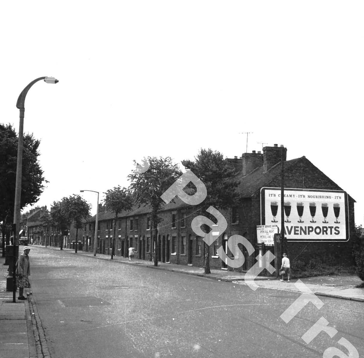 The photographer Dr. J.E.C. Peters left a note attached to the picture which implies that the end terrace house on the right with the Davenport's beer advertisement is No. 21 Greyfriars, which from around 1870 to 1909 was the Brown Horse Inn. The other sign advertises the Newport Road Service Station.