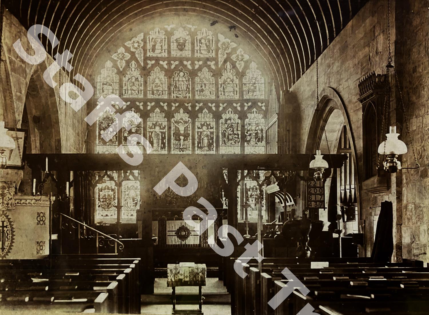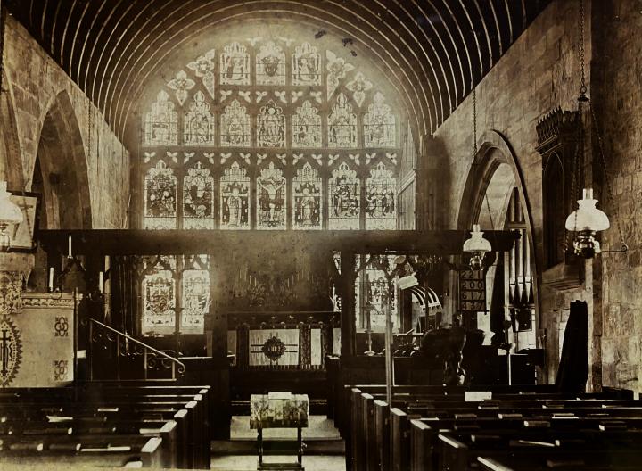Description:The interior of St. Editha's Church, Church Eaton looking towards the chancel and the impressive seven-light Perpendicular east window. This photograph was taken shortly after the installation of stained glass, designed by C.E. Kempe of London, in 1898.