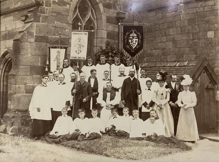 Description:A group photographed on the dedication of a new East window at St. Editha's Church, Church Eaton by the Rt. Rev. Hon. Augustus Legge, Bishop of Lichfield. The new stained glass was designed by C.E. Kempe of London in 1898; the donors were the Misses Ashton of Little Onn Hall.