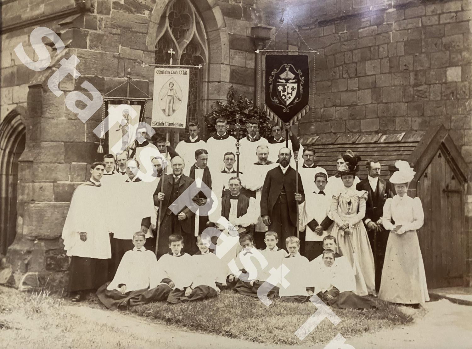 The Bishop of Lichfield is seated in the middle of the group. Standing either side of him, holding banners, are the Church Wardens, Mr. Pakeman and Mr. Vickers. The clergymen standing behind him include the Rector of Church Eaton, Rev. A.H. Talbot, and the Rev. W. Nicholson, from Meerbrook. Standing to the right are Eveline and Amy Ashton.