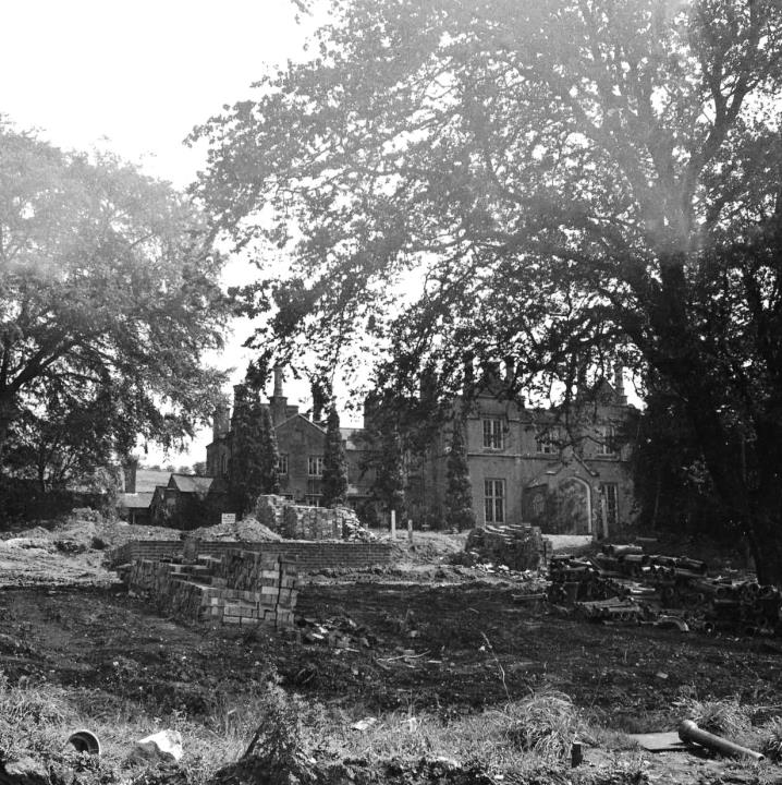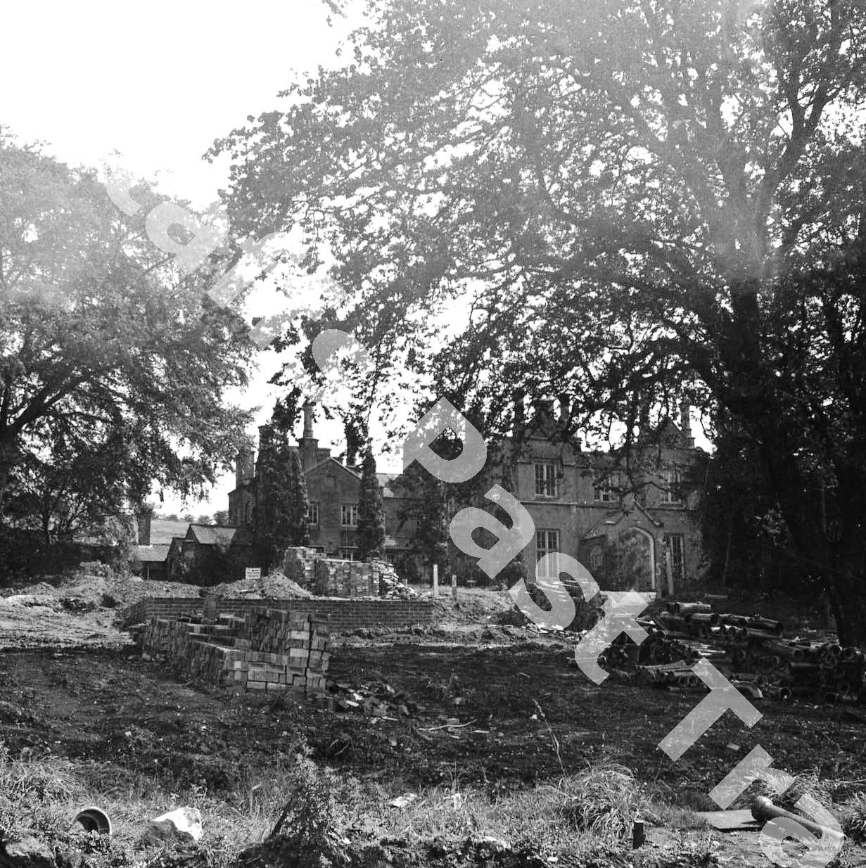 In the foreground building work alongside bricks and a stack of pipes can be seen. The photographer noted that the Rectory was surrounded by houses. The site is now (2025) housing on Dunsley Drive, Rectory Fields. A smaller modern replacement Rectory was built nearby.