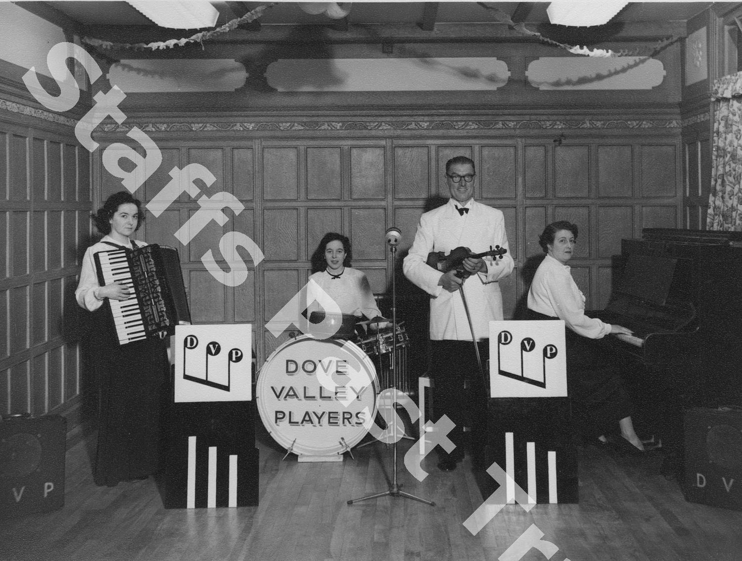 Description:Pictured in the Haddon room at Elkes café on the corner of High Street and Carter Street are the four band members of the Dove Valley Players. From left to right: Nancy Reeves (accordion), Joy Lawrence (drums), Fred Jenkinson (violin), and Lena Stafford (piano). Photograph by Alfred or Gerald McCann of Uttoxeter.