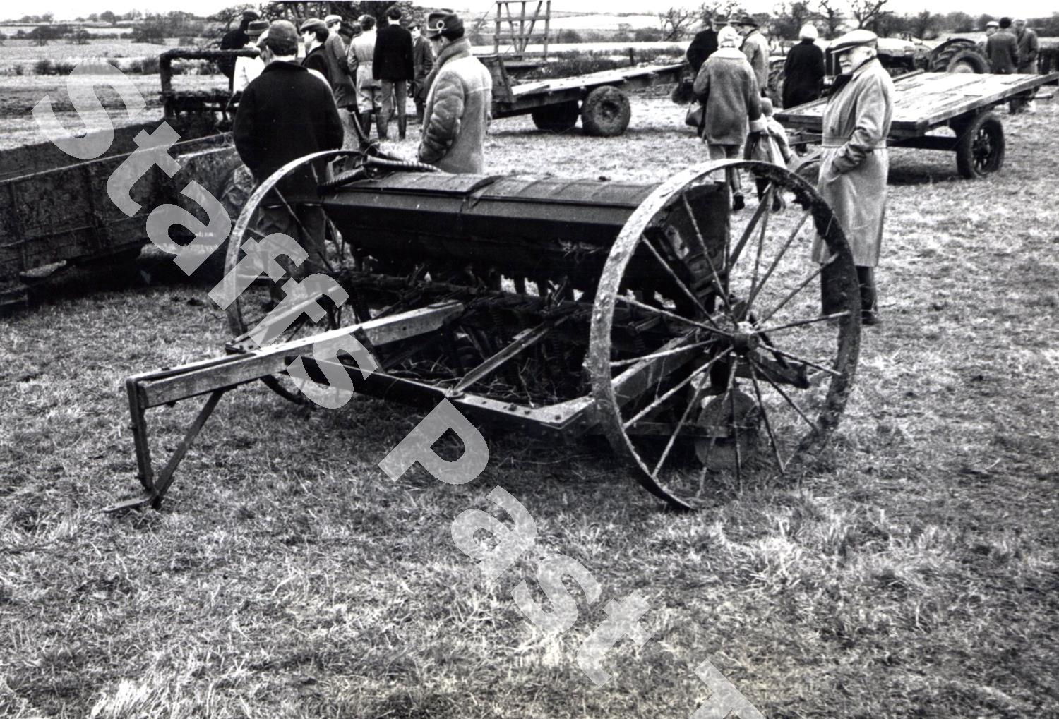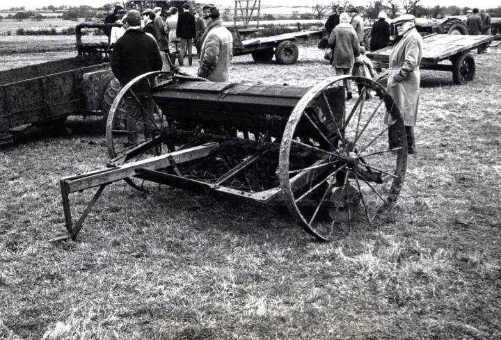 Description:Prospective buyers are pictured near to a seed drill and other lots at a dispersal sale at Greenhill Farm held by South & Stubbs Auctioneers; this was occasioned by the retirement of Mr F. Toon. The sale included 88 grand cattle; 108 sheep, a pony, good collection of agricultural implements and machinery; poultry houses, dairy utensils and barn machinery.