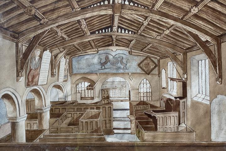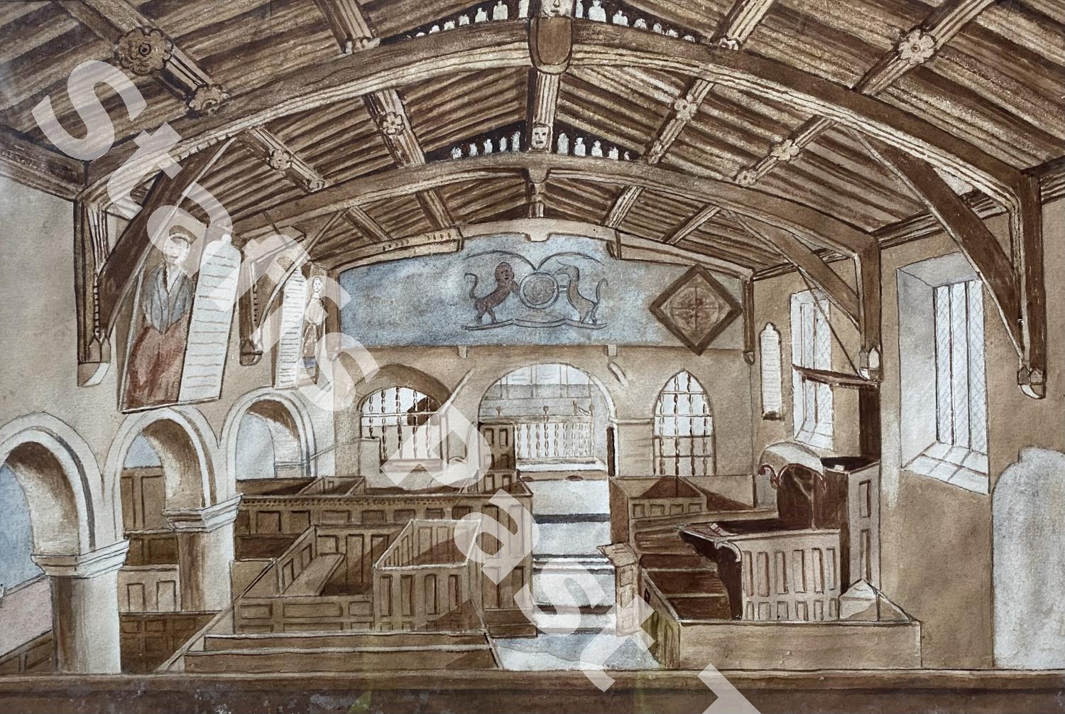 Description:A watercolour by an unknown artist showing the interior of St. Peter's Church, Alton looking east towards the chancel. It shows the church before the building of the south arcade and south aisle in 1830-1831.