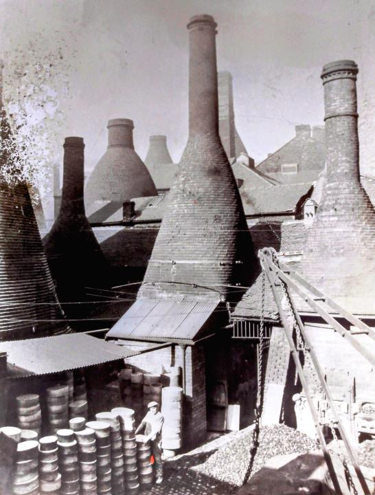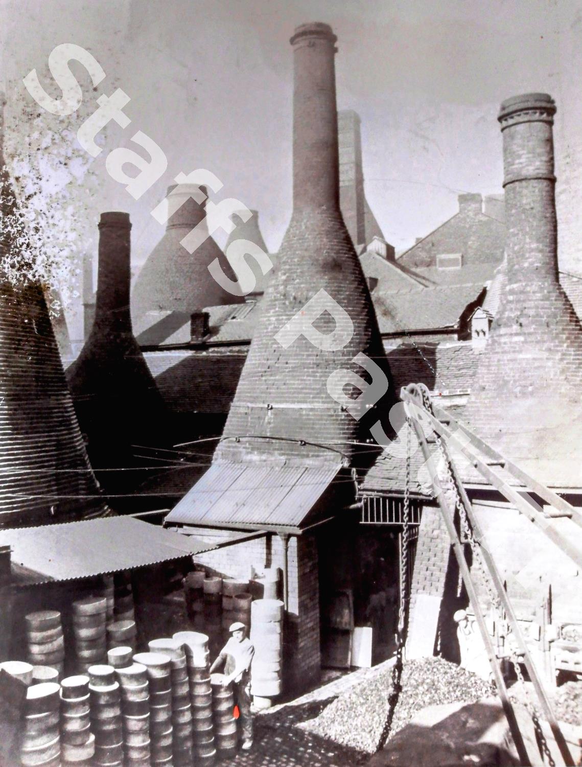 Description:This photograph of a pottery works with piles of ceramic wares and bottle kilns is often known as a potbank. The picture is thought to have been taken in the Longton area of Stoke-on-Trent. Please contact us if you recognise the potbank and the precise location.