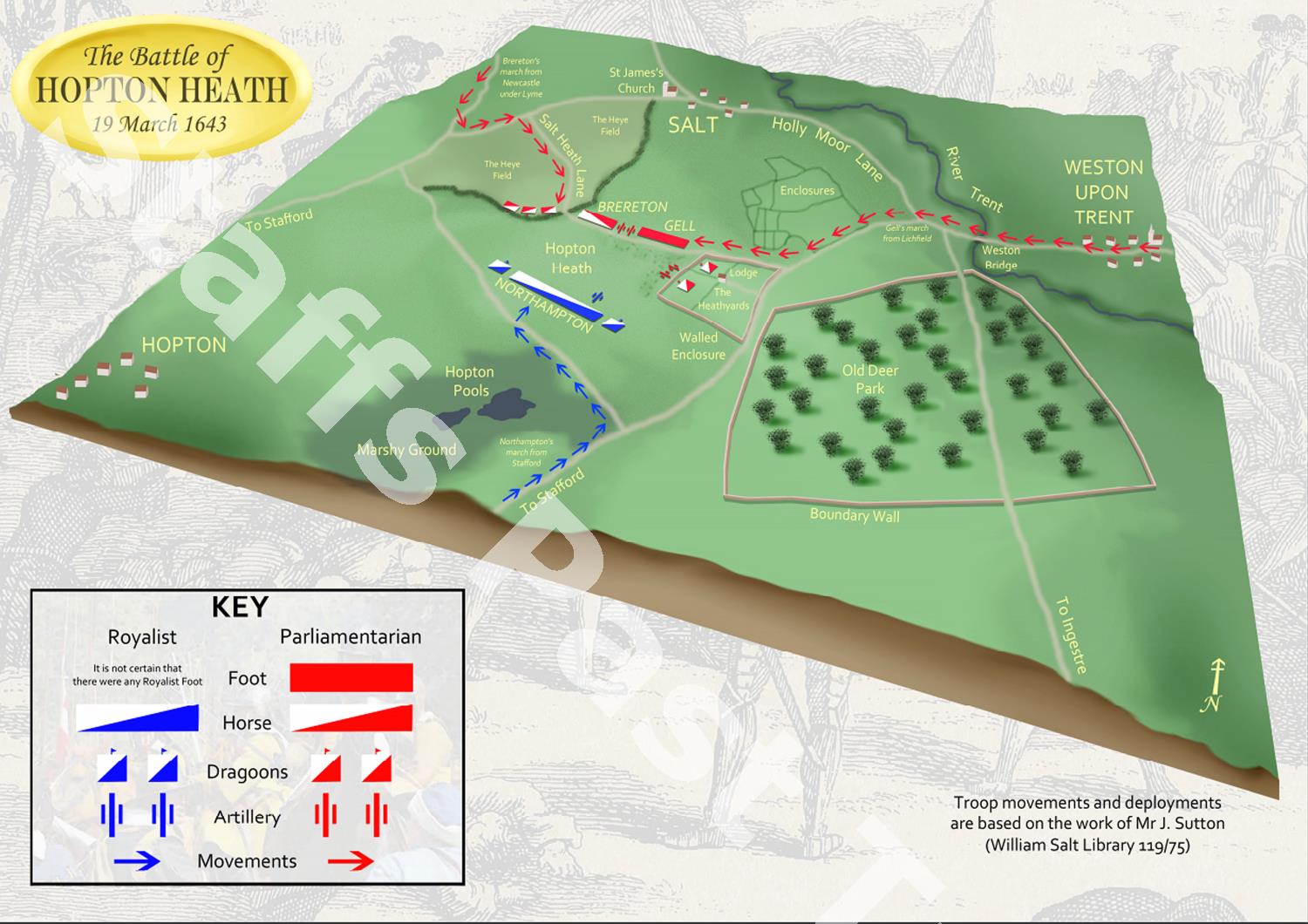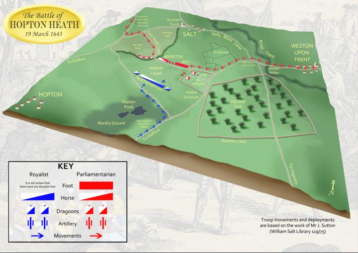 Description:Graphic map showing the assumed layout of the opposing forces at the Battle of Hopton Heath, fought between the Royalists and the Parliamentarians on March 19, 1643.