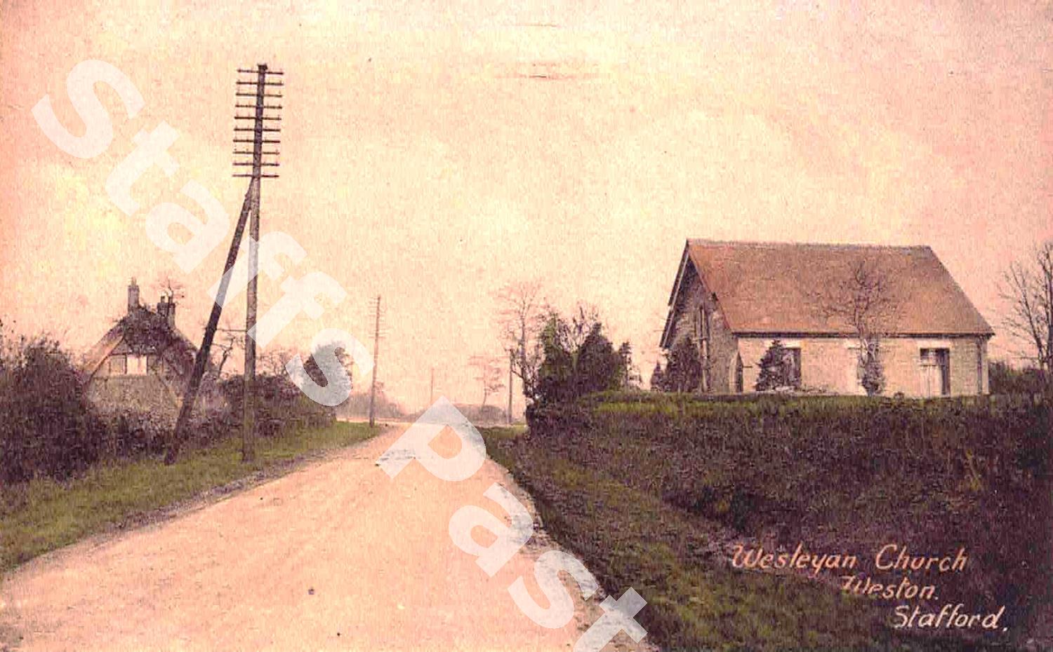 Description:A postcard view of the Wesleyan Church, London Road, Weston, looking north. It was built in 1899 and designed by Smith of Birmingham, and was extended in 1987. In later years the building remains (2025) and is now the Methodist Church.