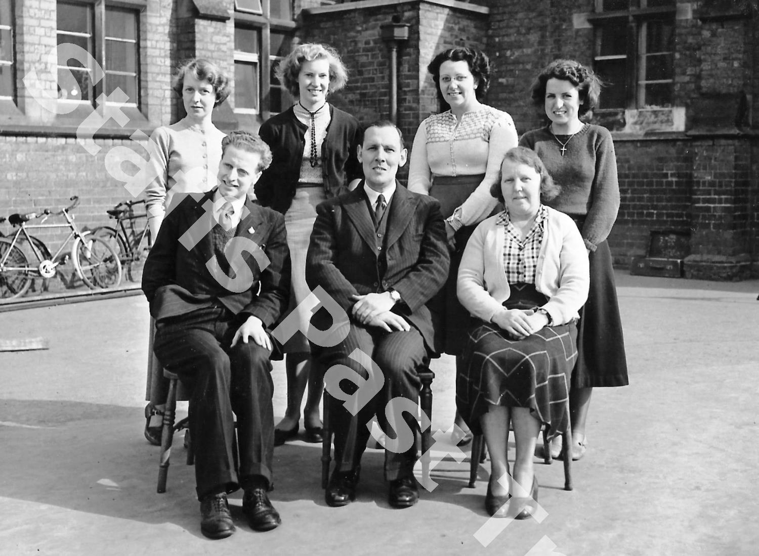 Description:Staff of St. John’s Primary School, Littleworth, Stafford. The school moved to new premises in the 1960's. The original school buildings were later demolished and replaced by a modern office building.