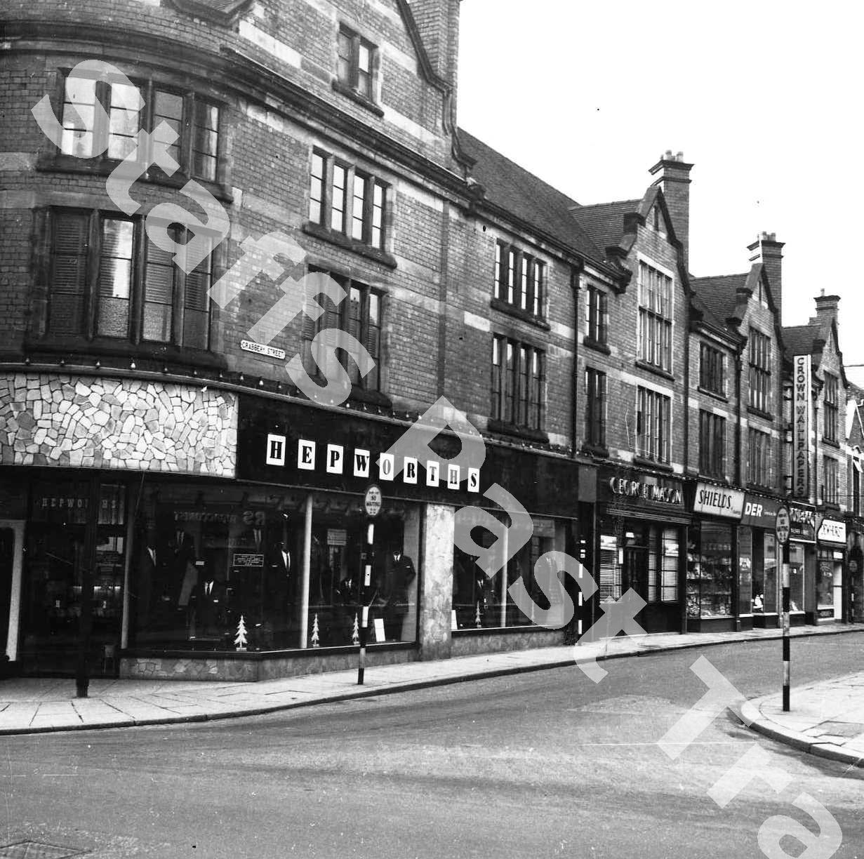 Description:Looking west along Crabbery Street, Stafford, the corner building dates from 1911 and is viewed here from the junction with Gaolgate Street. All of these buildings remain although over the years the ground floors have changed use on several occasions. In this scene the corner shop is occupied by Hepworth's which was a national Gentleman's Tailors business selling bespoke and 'made-to-measure' suits. The Stafford branch was No. 2, Gaolgate Street. Note the miniature Christmas trees in the shop windows and the lights above. In later years Hepworth’s moved further along Gaolgate Street and was rebranded into Next men’s and women’s clothing and footwear, subsequently moving to the Queens Retail Park. The premises then became Trespass an outdoor wear shop. After Hepworth’s moved from this corner site it was occupied by a succession of Jewellers and currently (2026) it is known as Masovia, a Polish bakery and café. Moving along to the right at No. 20 Crabbery Street is a branch of George Mason, a national chain of grocers, next door at No. 21 is Shields, fine china and glassware, then DER TV rentals at No. 22, at No. 23 is Rose & Co. decorating materials, then Dewhurst Butchers and on the extreme right is one of the entrances to Stafford Market.