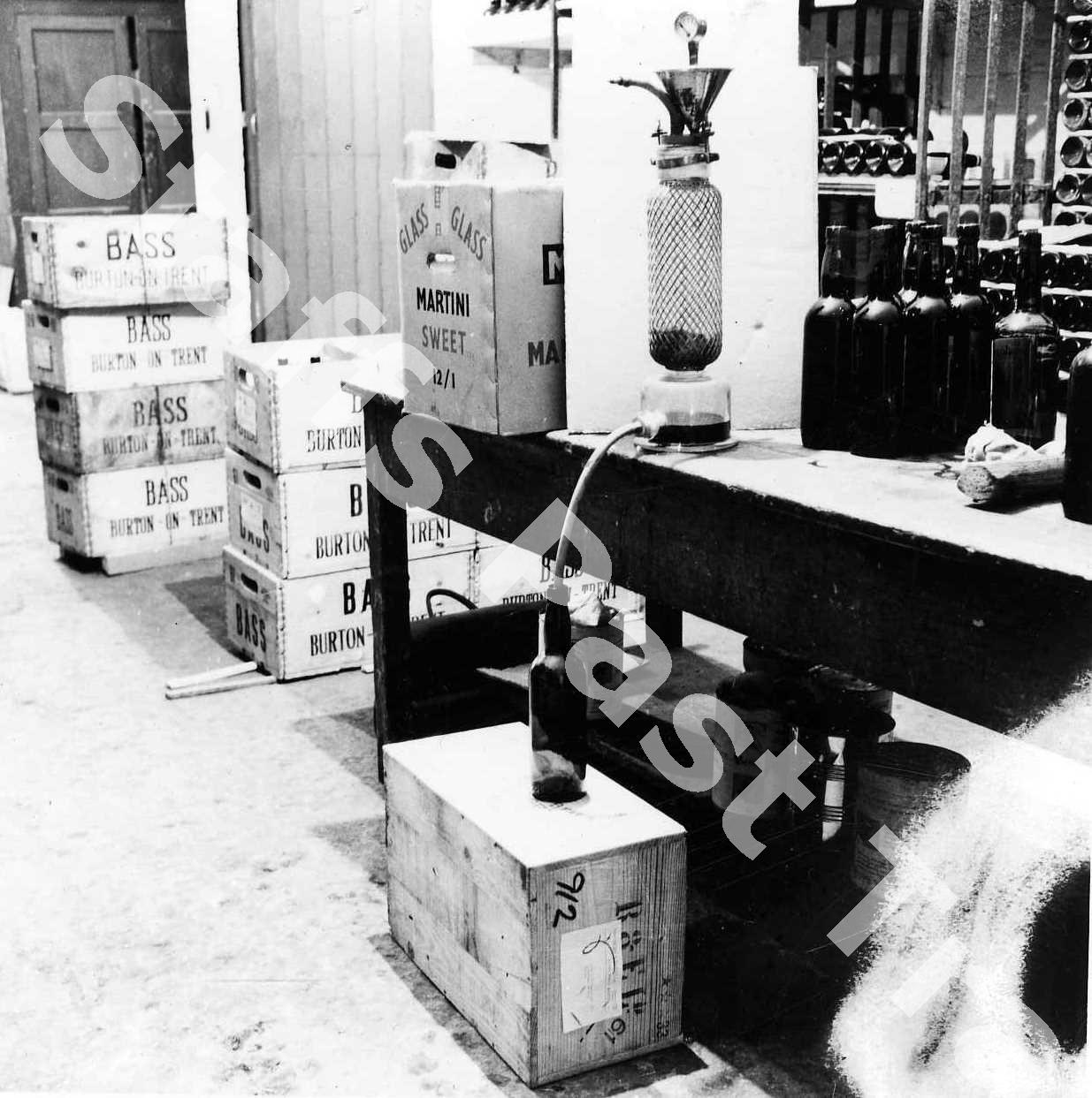 Description:A view of the cellar at Chas. E. Morgan, Wine and Spirits Merchant, of 57, Greengate Street, Stafford, which was established in 1780. They ceased trading in 1967. Currently (2026), the premises are occupied by Waterstones. This picture shows decanting (filtering) wine into a bottle in the cellar underneath the shop. In the background crates of Bass beer, a box of Martini sweet vermouth and racks of wine are visible.