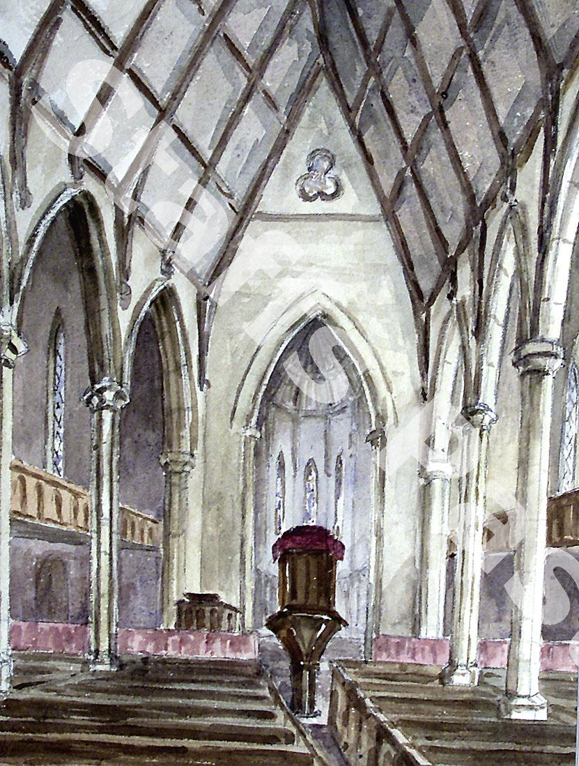 Description:St. Mark's Church, on St. Mark's Road, Chapel Ash was built in 1848-9, in the Early English style, from designs by C.W. Orford of Birmingham. This interior view looks towards the pulpit and chancel. This is one of a series of watercolours of all the churches in Lichfield Diocese in Staffordshire, painted by Miss Theodosia Hinckes and Mrs Rebecca Moore (wife of the Archdeacon of Stafford for Lichfield Cathedral) for Lichfield Cathedral between 1857 and 1861. Reproduced by Kind Permission of the Chapter of Lichfield Cathedral who retain copyright.