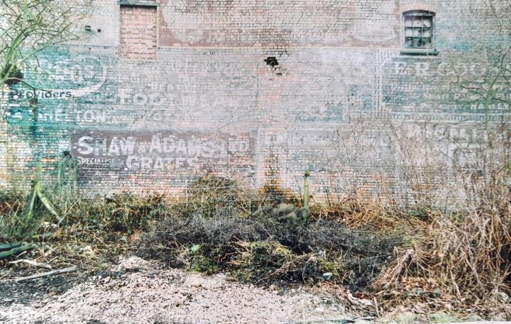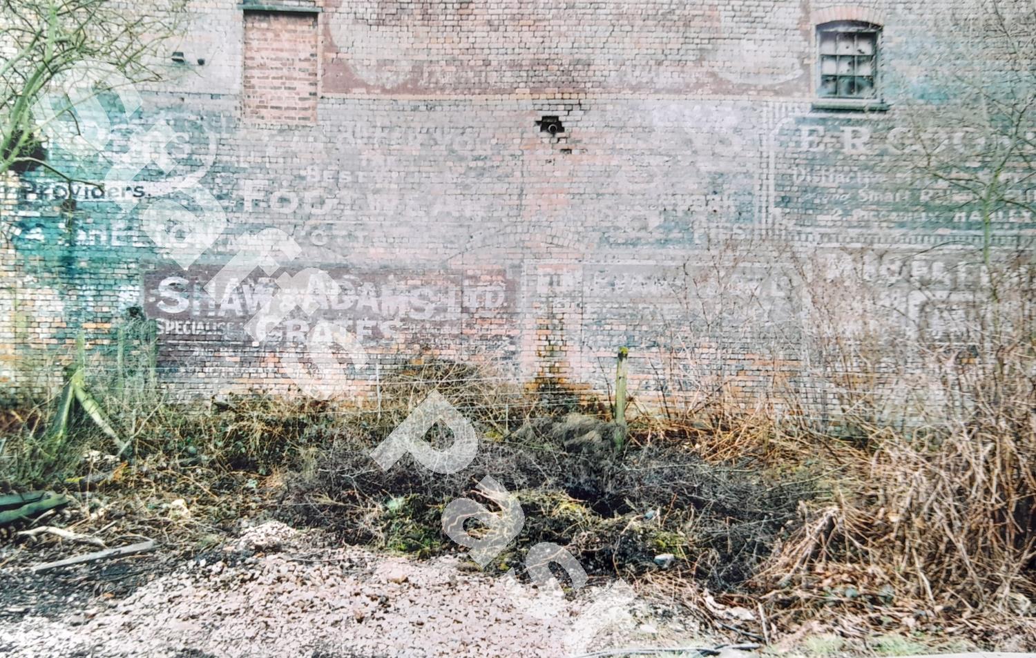 Painted 'Ghost' advertisements on wall near Etruria STation. Etruria Station was opened in 1848, ...