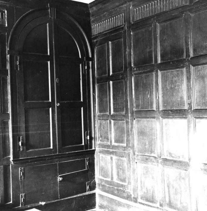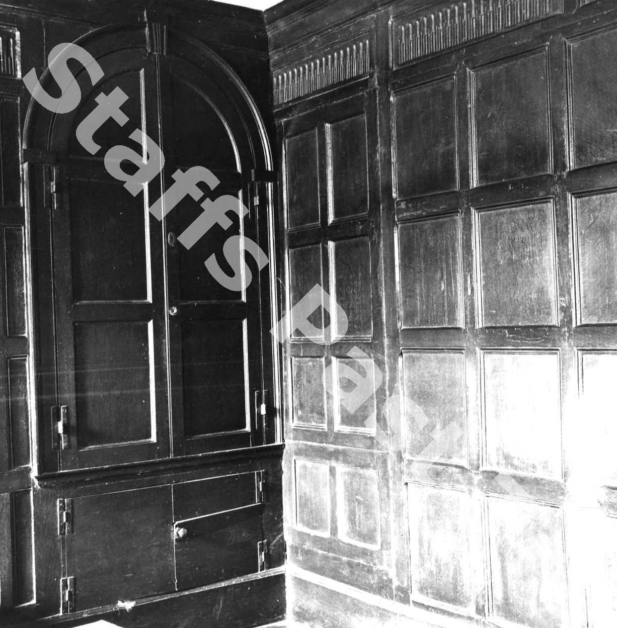 Description:This picture shows a ground floor front room off the entrance hall immediately to the right of the front-door. At this time the premises were being converted into County Council Offices. The building's Grade II Listing mentions the 17th century panelling to the right of the door with fluted panelling over and the round-headed cupboard which still exists in 2025.