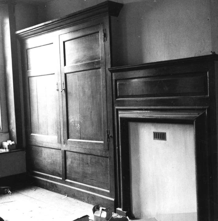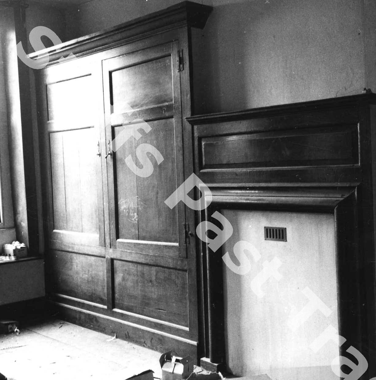 Description:This picture shows a cupboard with panelled doors and a boarded-up fireplace in a room on the 1st floor to the right. At this time the premises were being converted into County Council Offices.