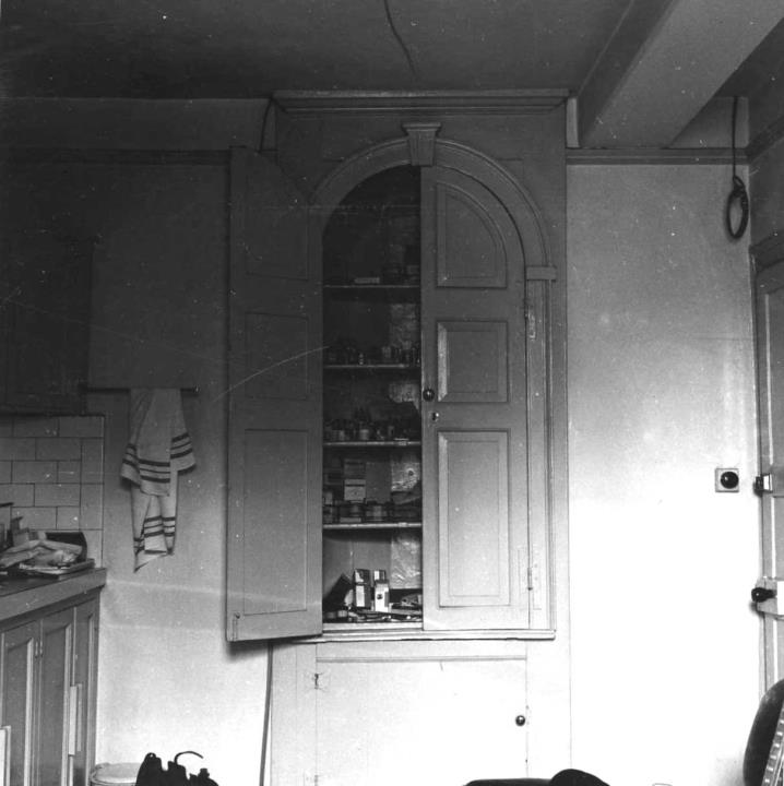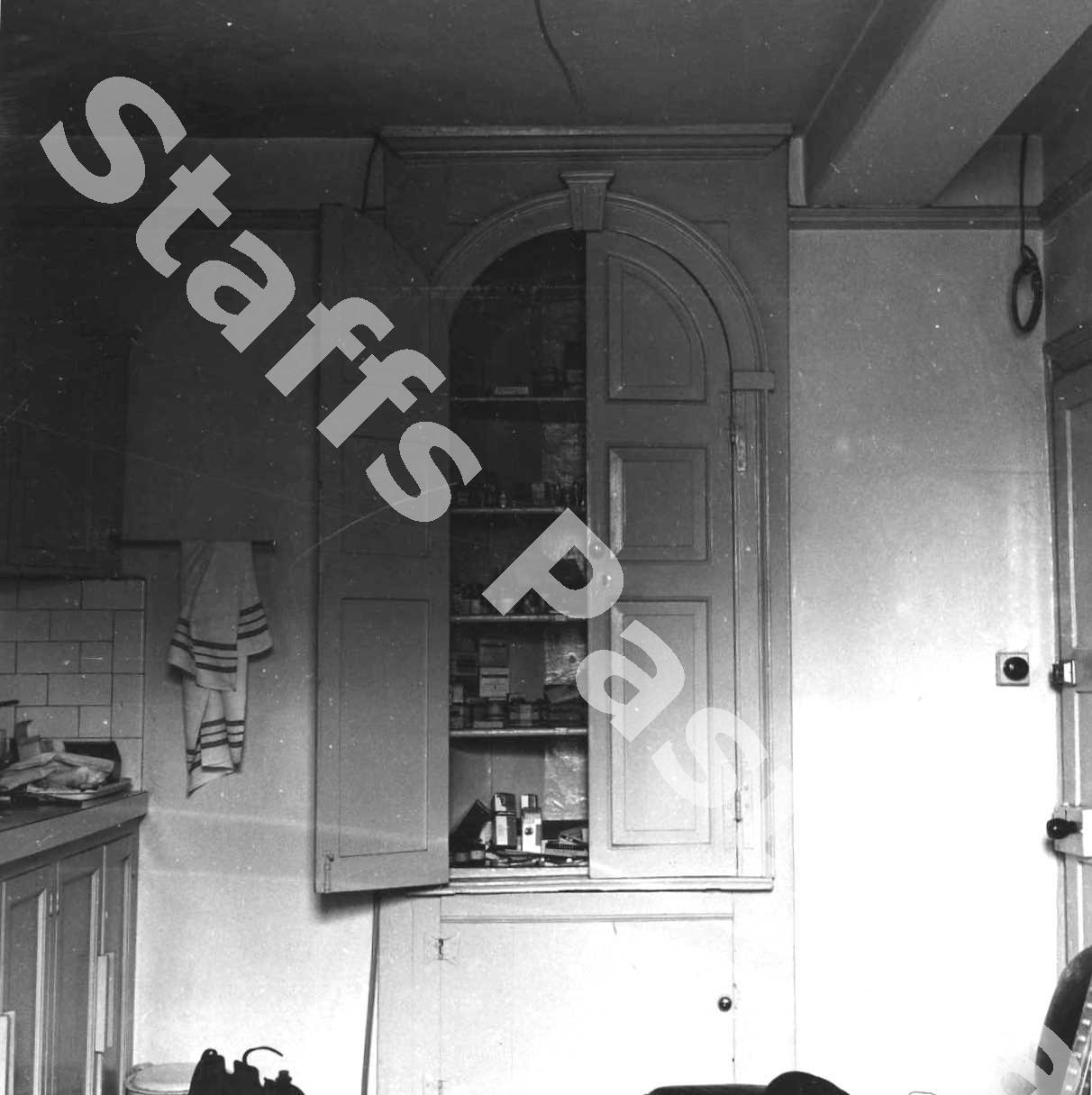 Description:This picture shows a ground floor front room to the left of the entrance with a round-headed built in two-tier cupboard. It was possibly being used as a kitchen or mess room. At this time the premises were being converted into County Council Offices. On the top right the coiled cable suggests the room was in the process of being re-wired.