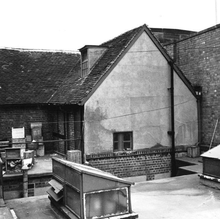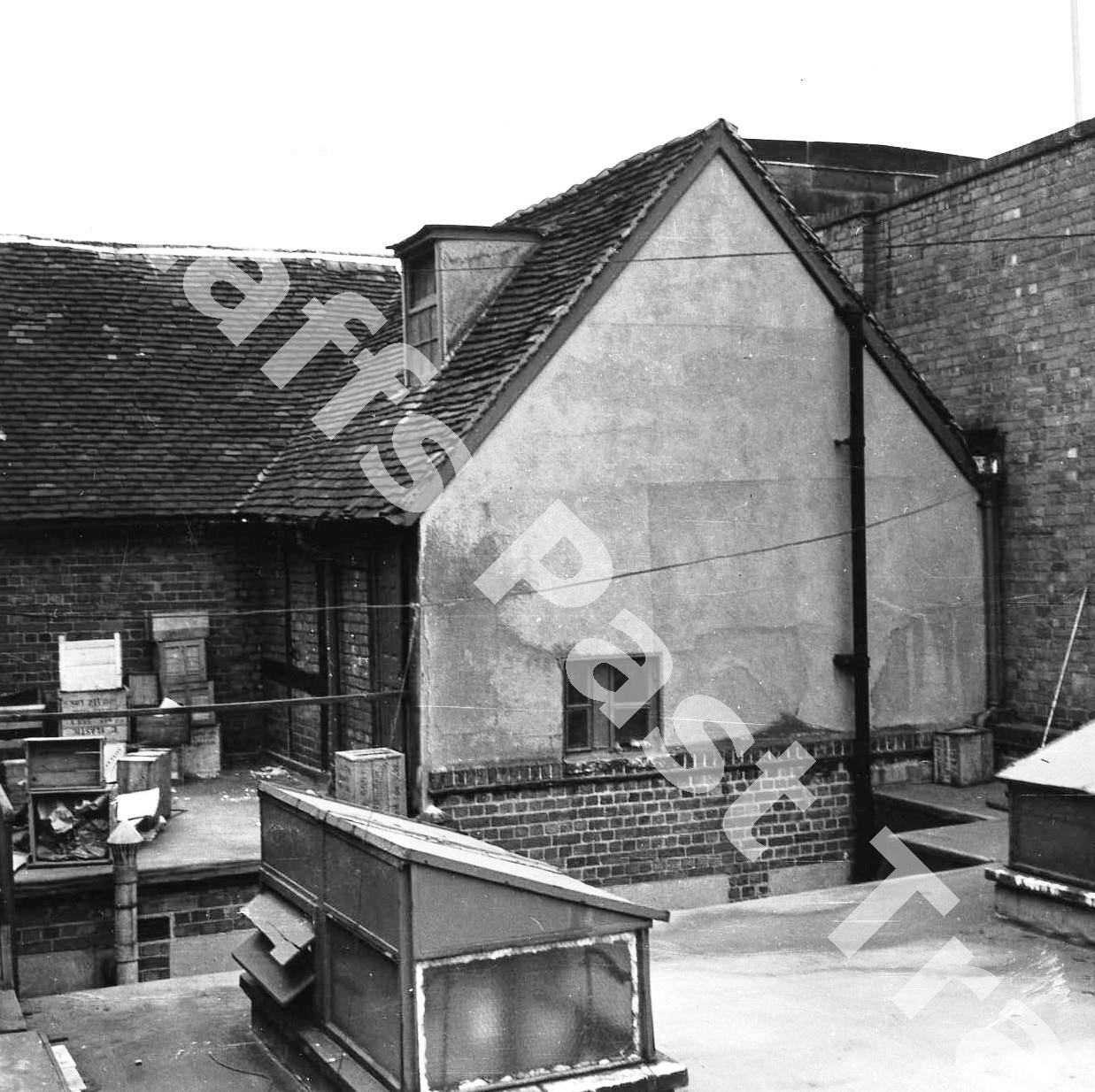 Description:A view of the rear of F.W. Woolworth's premises at 18, Market Square, Stafford. Some of the Grade II listed building's wooden frame can be seen. The building was later occupied by River Island clothes shop.