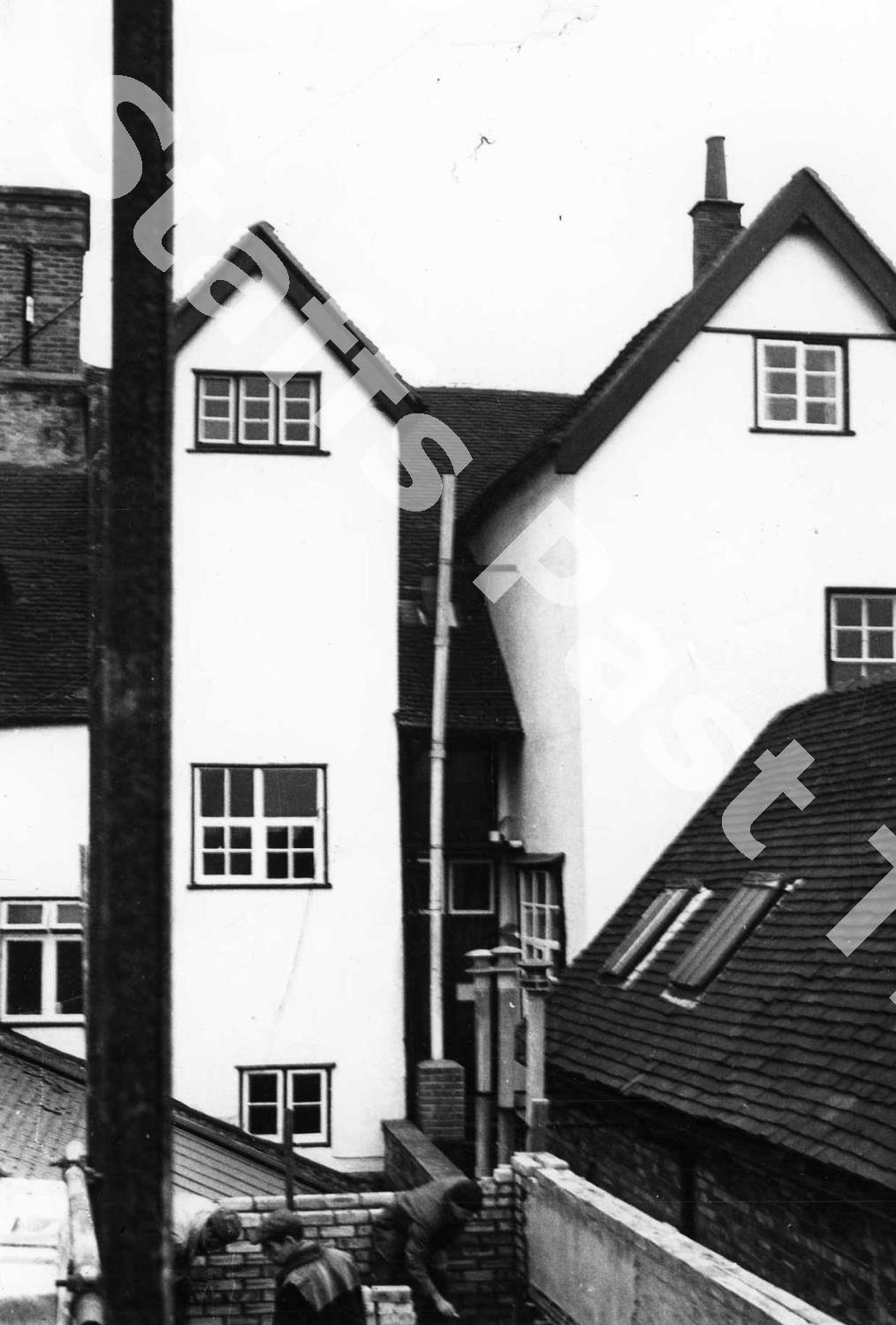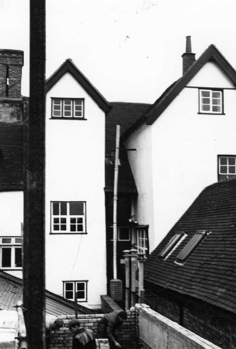 Description:Workmen are seen working on the roof of an outbuilding to the rear of the Ancient High House, Greengate Street, Stafford.