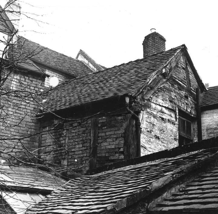 The rear of No. 5. Market Street, Stafford prior to demolition in 1963 showing the brick-infilled timber-frame ...