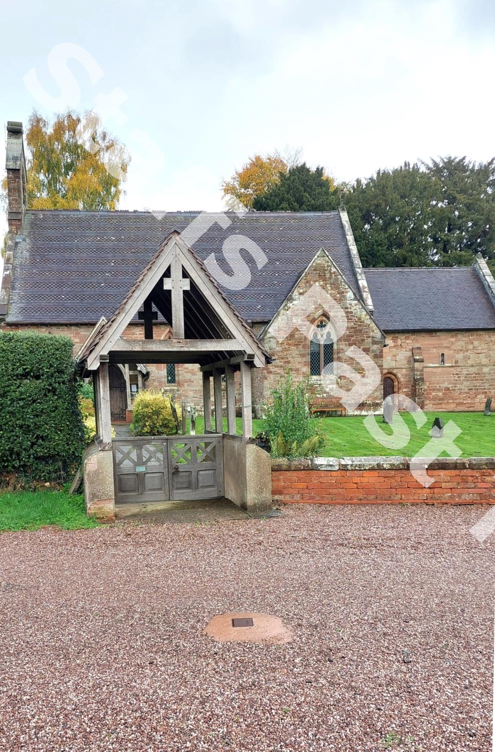 Description:Looking north through the lych gate towards St. John’s Church in Stretton.