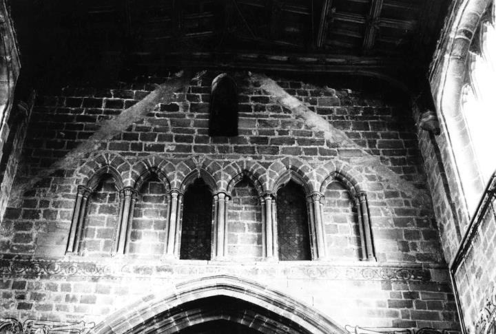 Looking east into the nave: a series of Arcadian windows above the tower's arch, four of which are 'blind', ...