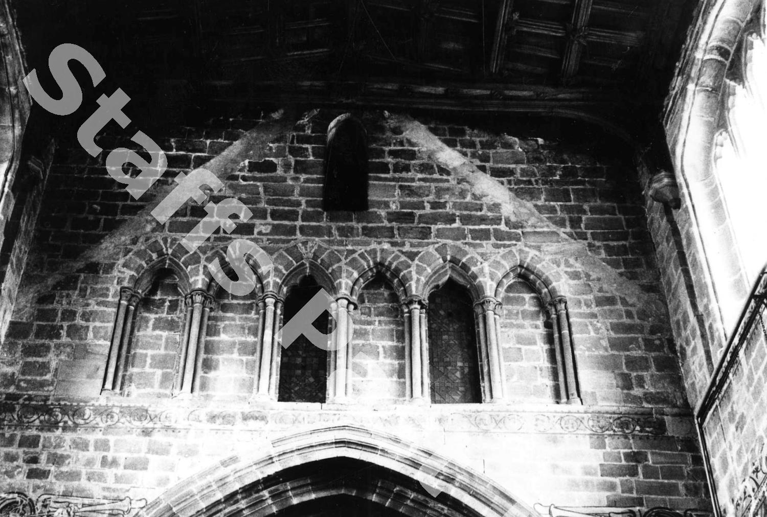 Description:Looking east into the nave: a series of Arcadian windows above the tower's arch, four of which are 'blind', denote the level of the bellringers' chamber. The scars above show the positioning of the original 13th century steeply pitched roof. On the right 15th century clerestory windows can be seen.