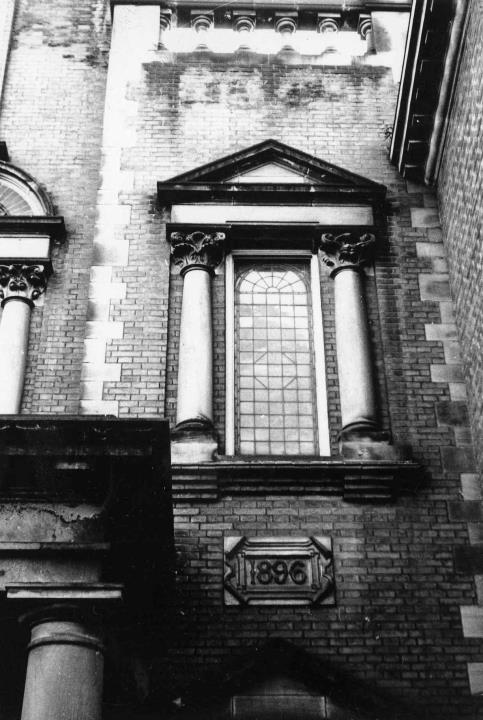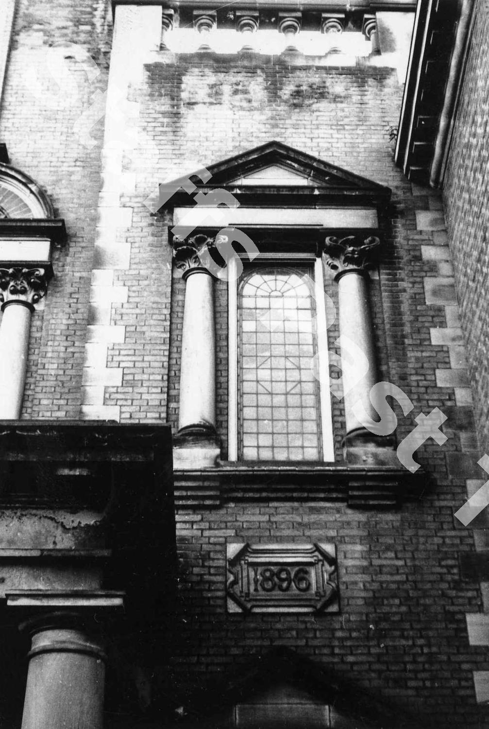 Description:Window above and to the right the central entrance portico on the front of the Congregational Church in Martin Street, Stafford. It was also known as Zion Chapel. A plaque below bears the chapel's 1896 rebuild date when the frontage was modified.
