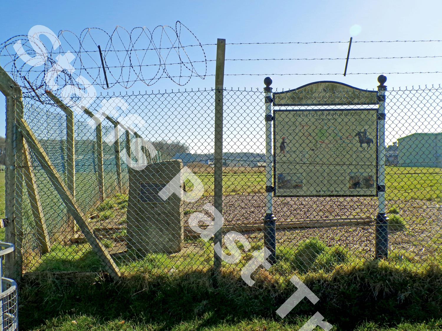 Description:View of the battlefield memorial and accompanying information panel, erected by the West Midlands Branch of the Military Historical Society in 2009. Both memorial and panel stand within the Ministry of Defence site, visible through the chain-link fencing. Hopton Heath was only pitched battle of the 17th century civil wars to be fought in Staffordshire - other military action was confined to sieges (such as at Lichfield) or smaller-scale skirmishes. A Parliamentarian force advancing on Stafford was confronted by Royalist troops who were occupying the town. The fighting was marked by repeated Royalist cavalry charges and the death of their commander, the Earl of Northampton. However, the Parliamentarians withdrew from the field at the end of the fighting, abandoning their artillery which was subsequently captured by the Royalists. Both sides claimed victory, but it is largely considered indecisive by modern historians. However, the Parliamentarian aim of capturing Stafford was thwarted - although the town would later fall to them due to treachery. The battlefield today is partly agricultural land and partly property of the Ministry of Defence. However, public footpaths crossing the area allow a good view of much of the field.