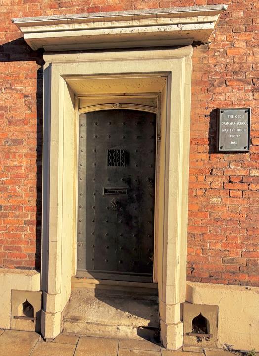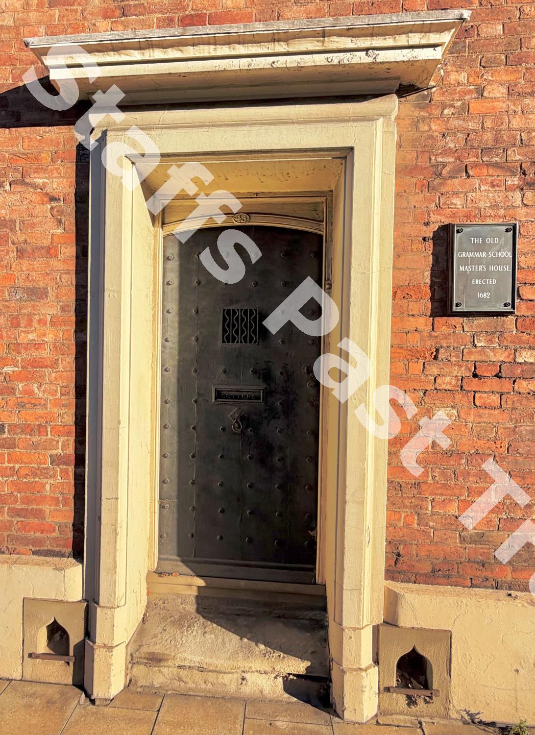 Description:The main front entrance of 45, St. John Street, Lichfield, which currently (2026) houses Lichfield District Council's Council Chamber. Note: the studded door, plaque and boot-scrapers.