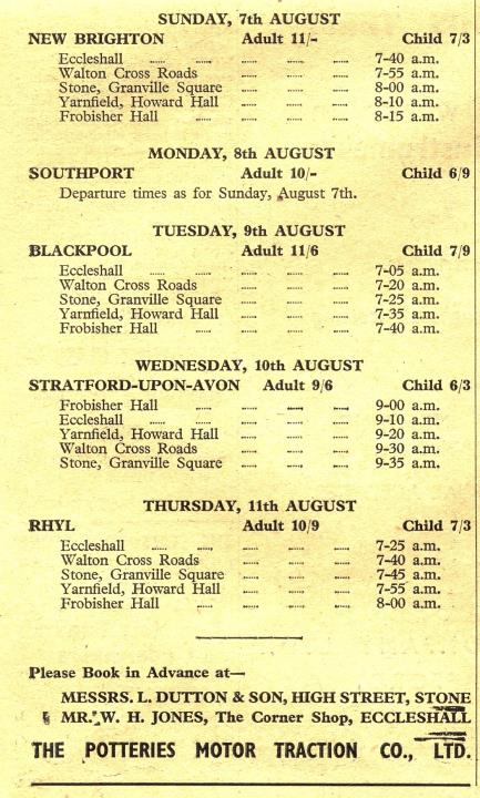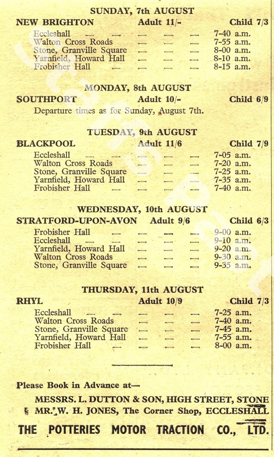 Description:Advertisement title: 'P.M.T. Tours' Part 2 of an advertisement for trips and outings with the P.M.T. (Potteries Motor Traction Co., Ltd.) during July and August 1955. Tickets were to be booked in advance at: Messrs. L. Dutton & Son, High Street, Stone or Mr. W.H. Jones, the Corner Shop, Eccleshall. This advertisement was published in the Stone Guardian on Saturday 30 July 1955.