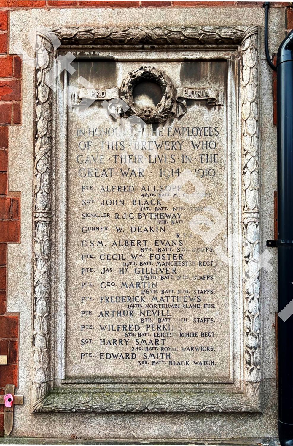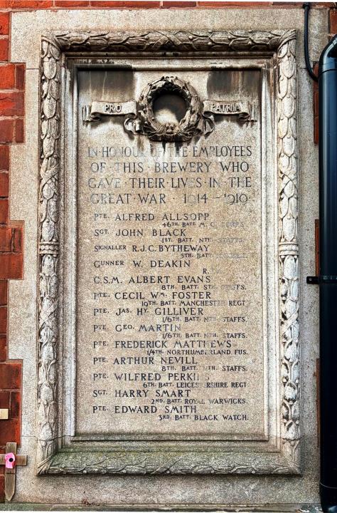 The stone memorial panel to thirteen employees of the Lichfield Brewery Co. who gave their lives in ...
