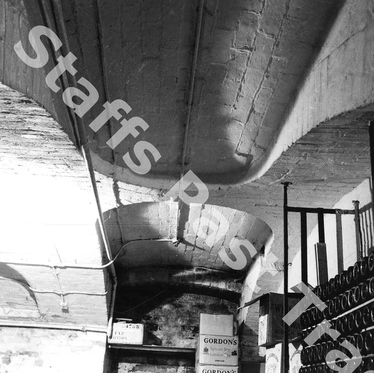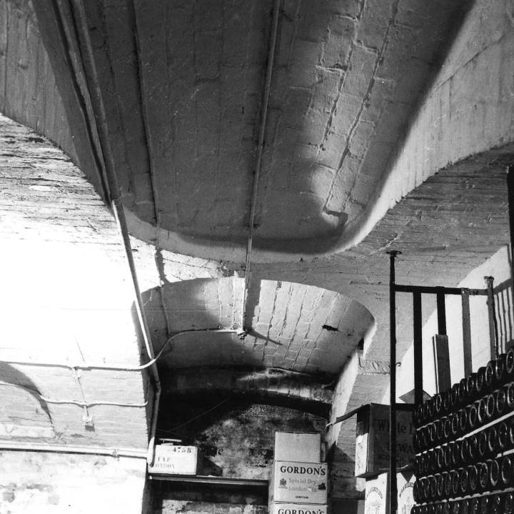 Description:A view of the cellar at Chas. E. Morgan, Wine and Spirits Merchant, of 57, Greengate Street, Stafford, which was established in 1780. They ceased trading in 1967. Currently (2026), the premises are occupied by Waterstones. In this picture boxes of Gordon's Gin and a rack of wine bottles can be seen below the vaulted roof of the cellar underneath the shop.